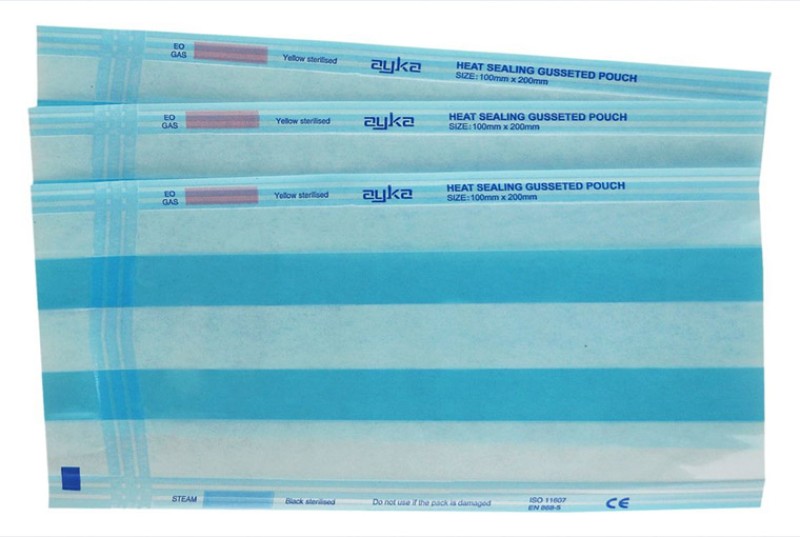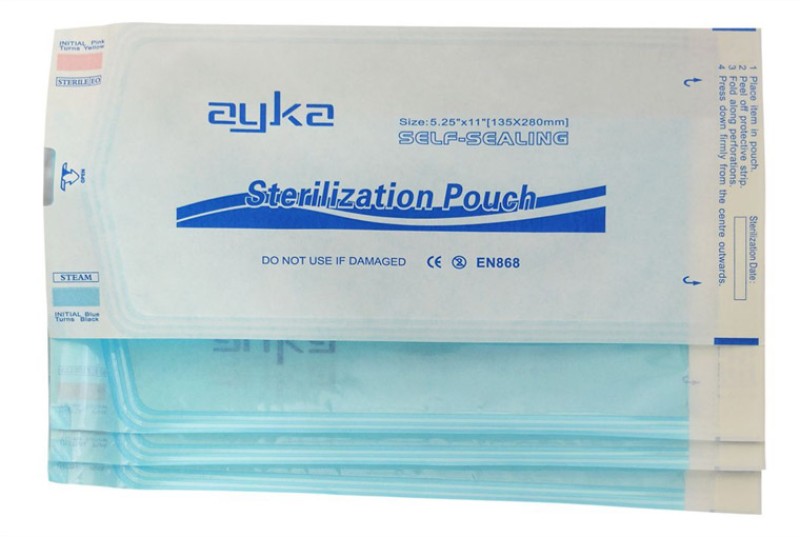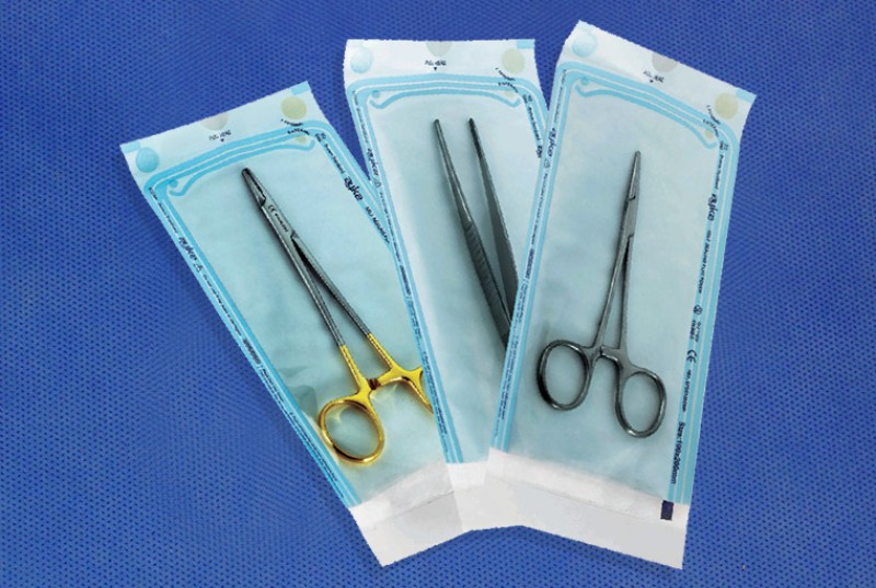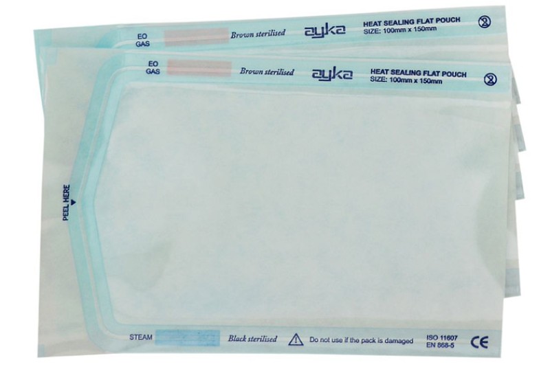 Self-seal and heat-seal sterilization pouches, designed for maximum protection and easy instrument identification. Each pouch includes two external process indicators for steam and EO sterilization and offered with choice of heat seal and self seal mechanism. To assist opening, a convenient thumb notch is postitoned at the top of the pouch above the chevaron seal.