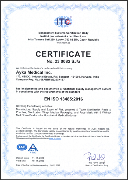 Ayka Medical is ISO 13485:2016 certified, ensuring our quality management system meets the highest international standards for medical device manufacturing.